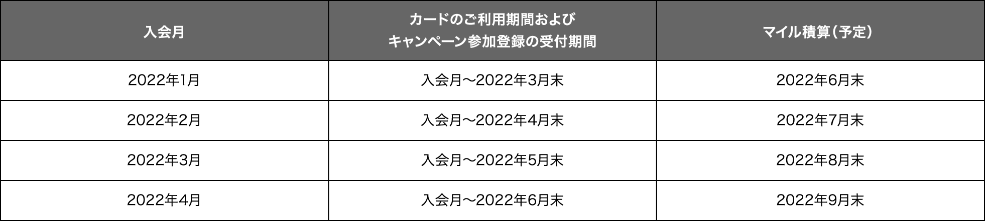 (対象条件:参加登録ご利用) - ※マイルは入会月の5カ月後の月末(予定)にJMBマイル口座に積算いたします。また、期日内のキャンペーン参加登録が必要です。詳しくは以下の表をご確認ください。