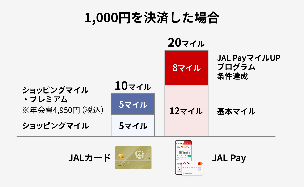 - ショッピングマイル:通常200円で1マイル、JALカードショッピングマイル・プレミアム(年会費4,950円)へ入会すると100円で1マイル貯まります。