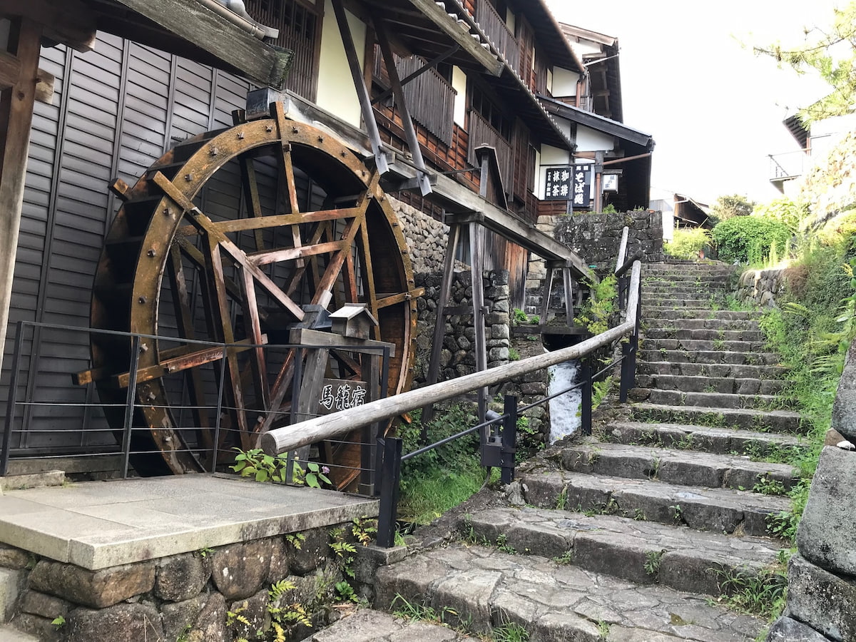 石畳の両側には、木造の町家や土産店、茶屋が軒を連ね、ノスタルジックな風情が漂います。水車の音が心地よく響く小道や、恵那山を望む見晴台など、写真映えするスポットも多く、散策にぴったり。
