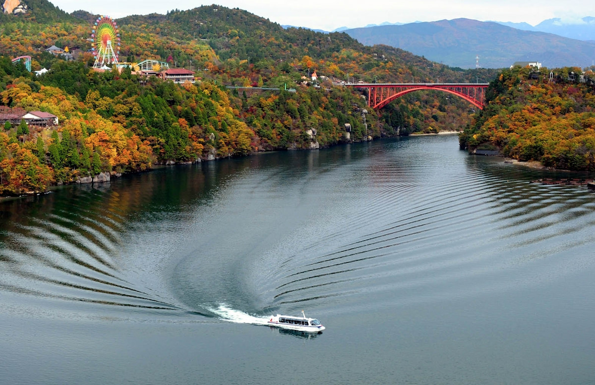 名物の遊覧船では「軍艦岩」「獅子岩」「品の字岩」など、個性的な形をした岩を間近で観賞できます。春はサクラやツツジ、夏は新緑、秋は紅葉、冬は渡り鳥の飛来と、四季折々に違った表情を見せるのも魅力。特に紅葉や桜のシーズンは人気が高く、多くの観光客が訪れます。