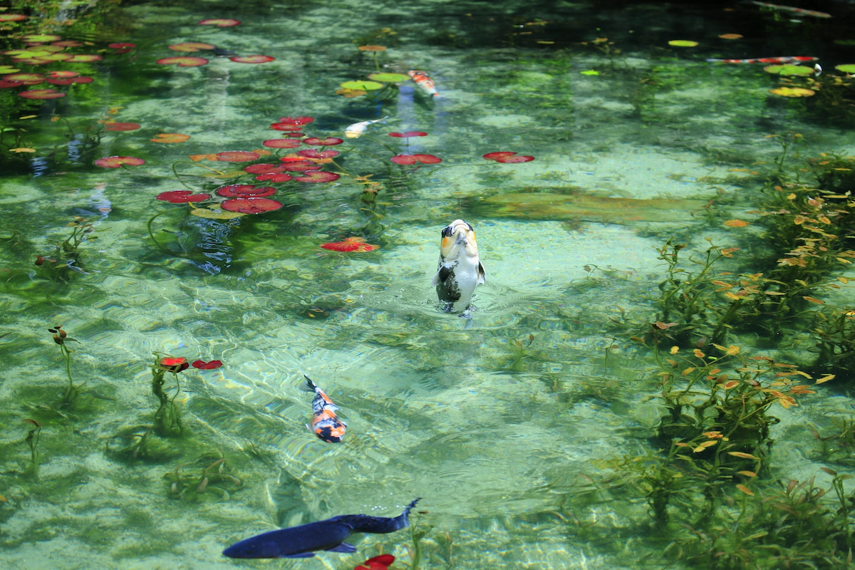 モネの池は1年を通してさまざまな風景を楽しめます。春から夏にかけては新緑と睡蓮、そして透明な水が鮮やかに輝き、秋には紅葉が水面に映りこみます。冬には雪とのコントラストでより一層幻想的な風景に。光が差し込む午前中の時間帯には、水面が青く透き通り、錦鯉や睡蓮がいっそう美しく映えます。雨のあと数日は水が濁ることもあるため、透明感を楽しみたい場合は晴天の翌日が狙い目です。