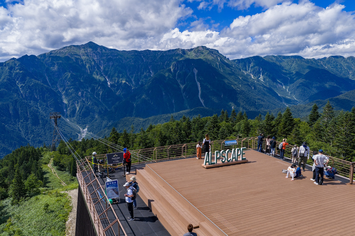 屋上展望台「AlpScape(アルプスケープ)」は2025年7月にリニューアル。新設されたウッドデッキからは、これまでよりも高い視点で北アルプスの山々を一望できます。また、隣接する「頂の森」では散策路や展望回廊を歩きながら、自然の息吹を間近に感じられます。