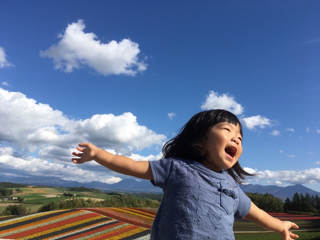 - 羽田から旭川へ! おじいちゃんおばあちゃんと一緒に北海道旅行。旭岳、旭山動物園、そして富良野・美瑛へドライブ。美瑛での一枚。2歳ながら開放感からとても気持ち良さそうに飛んでいます。 みんなにとって忘れられない旅になったでしょう。