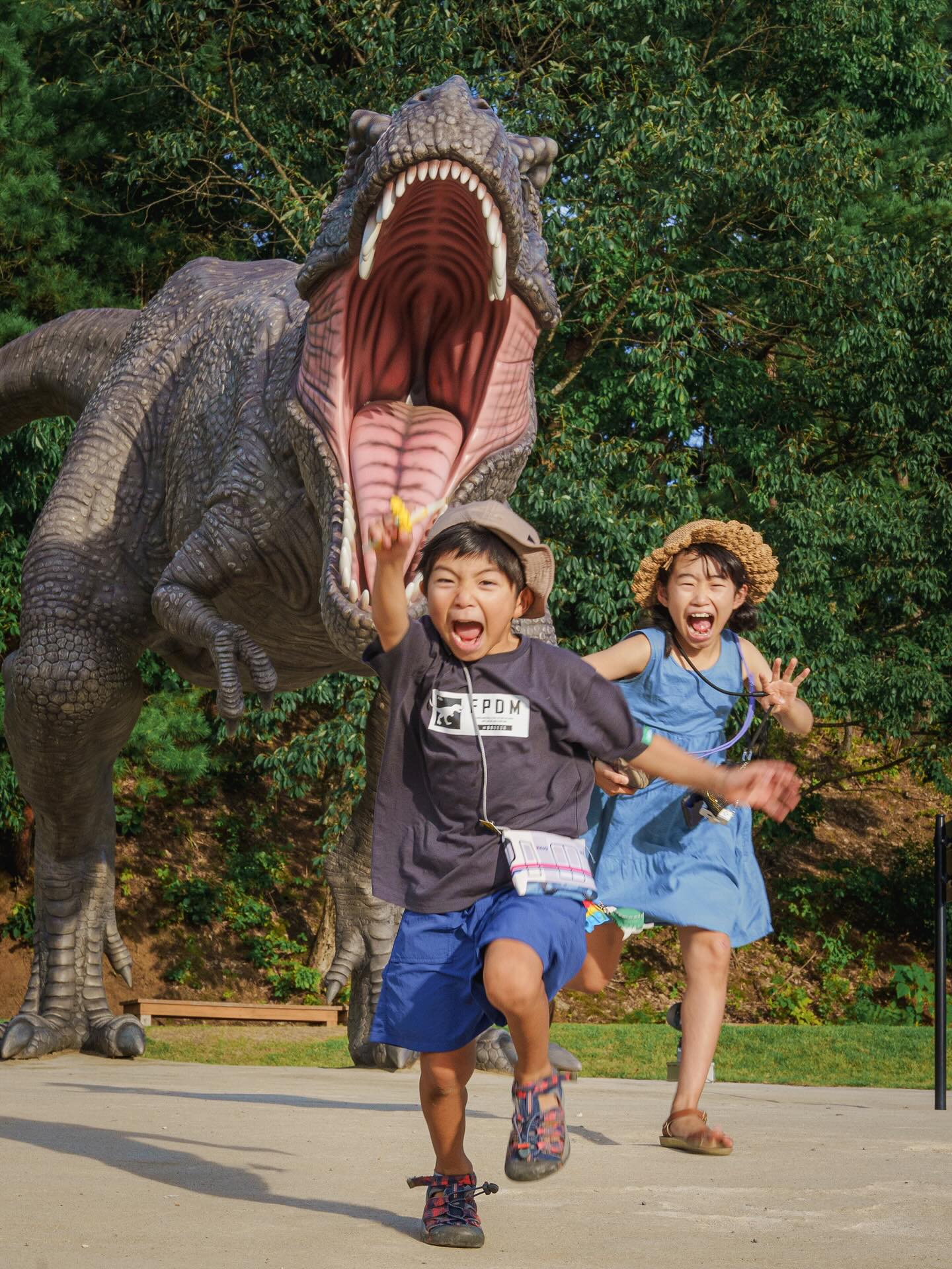 恐竜好きな息子たち念願の福井旅行での1枚。どこもかしこも恐竜だらけで大興奮!リアルジュラシックパークの世界に、食べられちゃう〜!逃げろ〜!な1枚です。