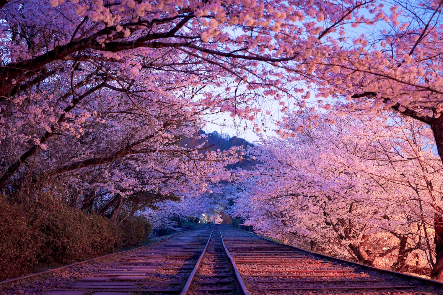 明け方の静まり返った線路跡に、満開の桜がトンネルのように咲き誇っていました。
