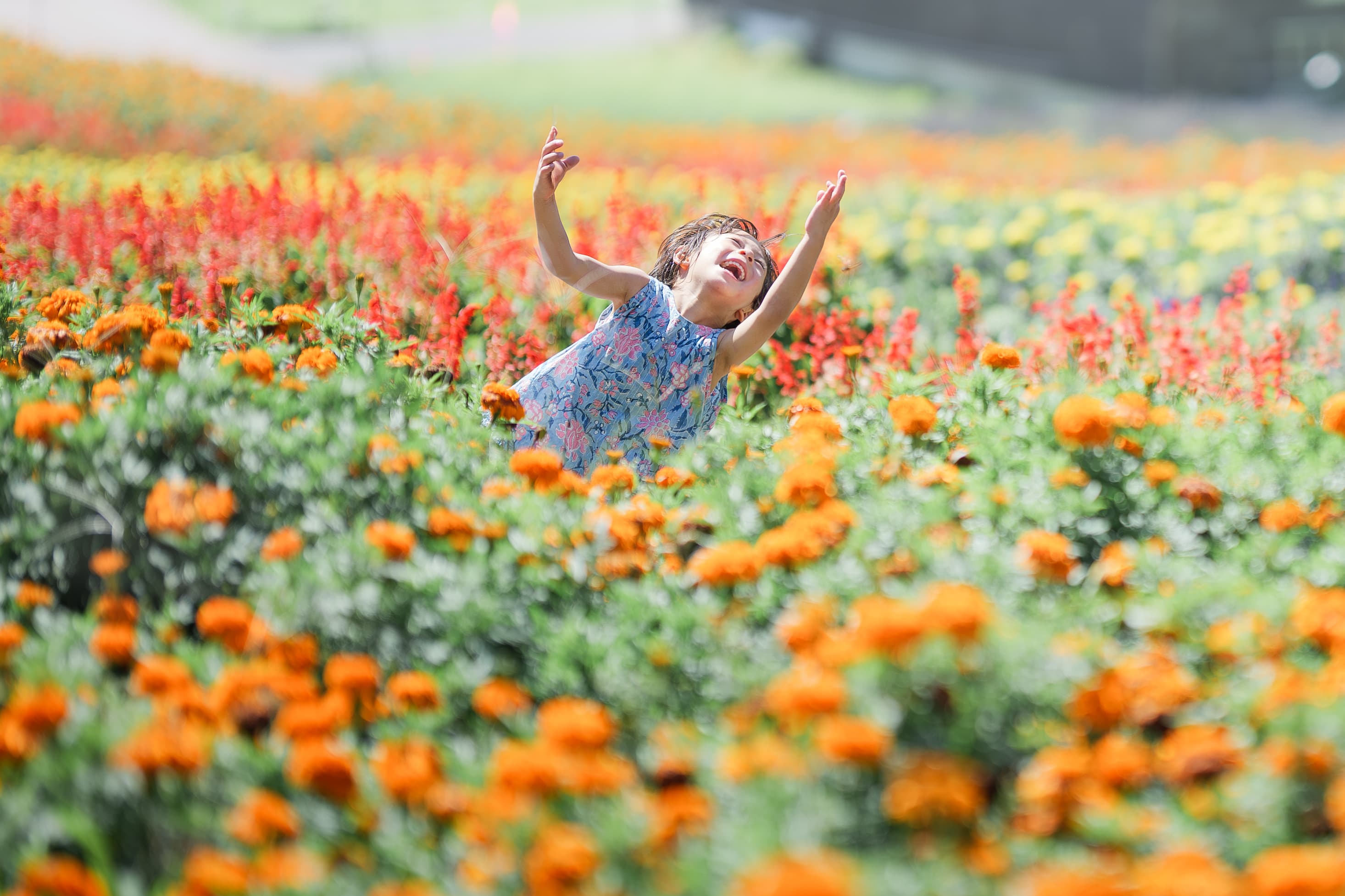 太陽のように明るい花々の中で、それ以上に輝く笑顔が弾けたこの瞬間。見ているだけで、思わずこちらまで笑顔になってしまいます