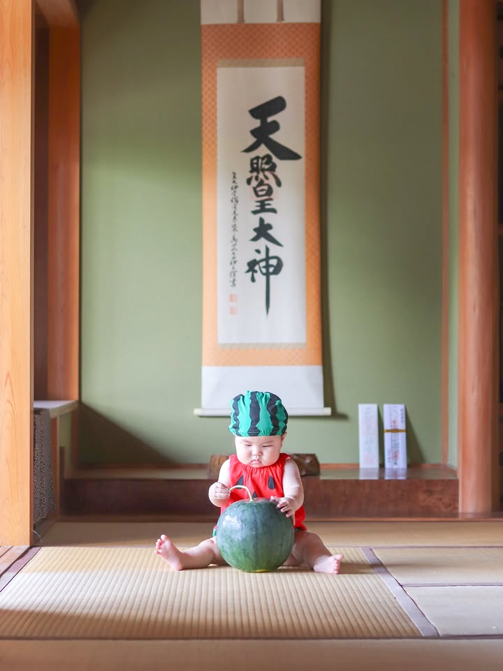 はじめてすいかを見るすいかの服を着た赤ちゃん。