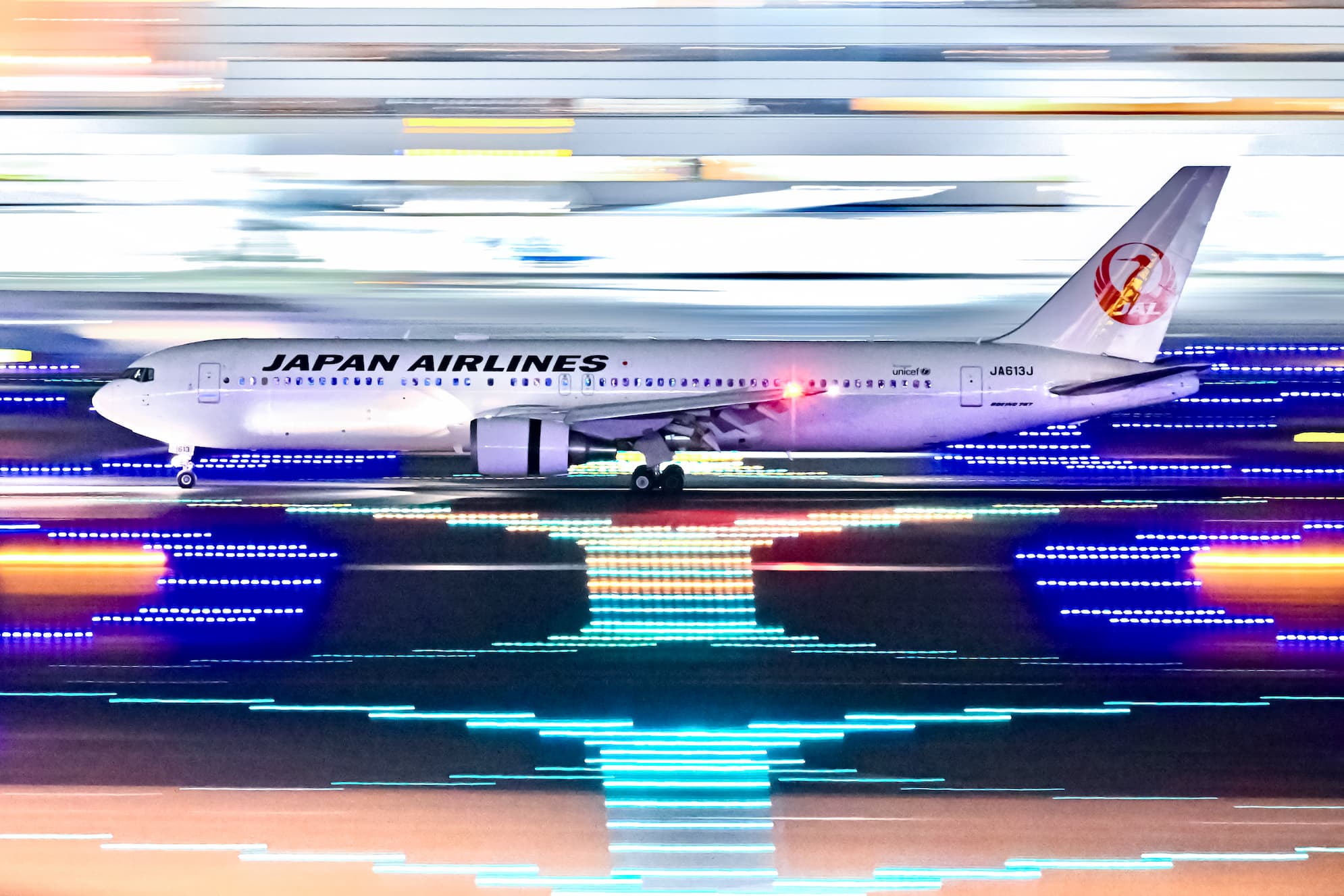 夜の羽田空港に降り立つJAL B767-300。退役を目前にした姿を、流し撮りで捉えました。機体を包む誘導灯は、まるで夜空から流れ星が降り注ぐよう。凍える夜の空気の中ファインダー越しに感じたあの一瞬の輝きと感動は、今も心に深く刻まれています。