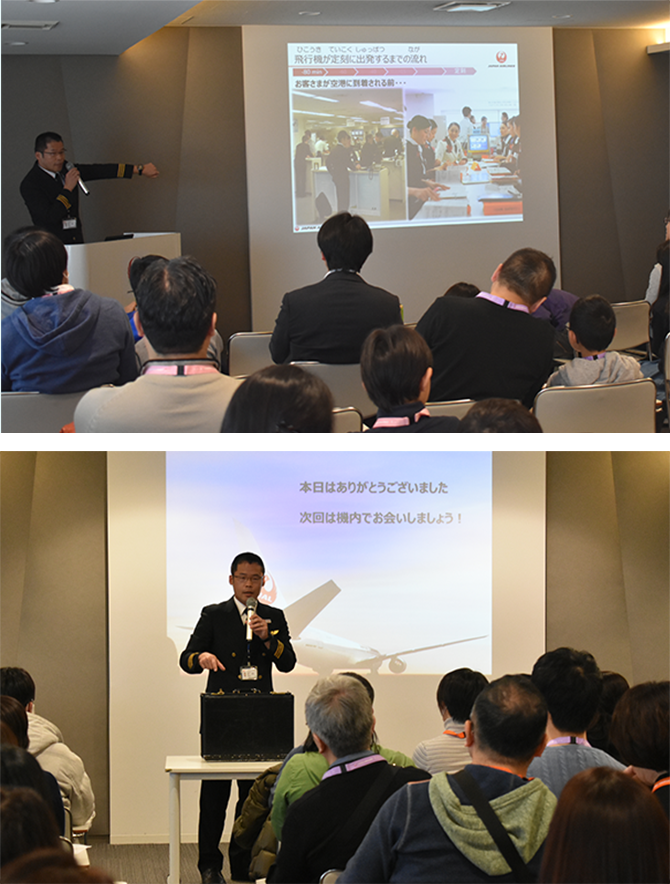 日本航空が保有する各種機体の説明にはじまり、フライト(乗務)までのパイロットのお仕事内容をご紹介いただきました。