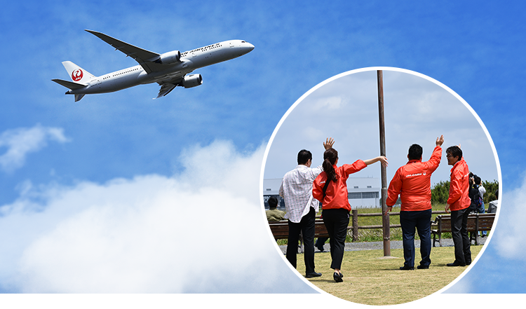 講話を担当した浅野キャプテンが操縦する飛行機(JL723クアラルンプール行)に手を振るJALカードスタッフ。